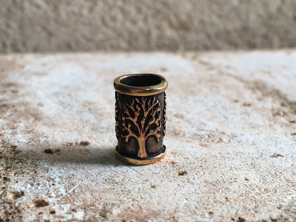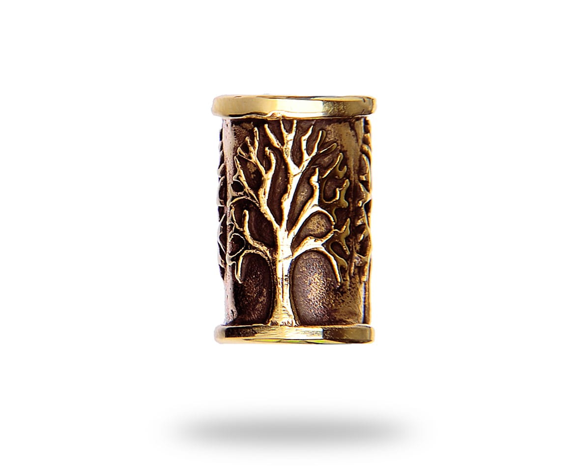 Wykonany z brązu, lśniący koralik do brody z efektownie wykonanym drzewem życia.