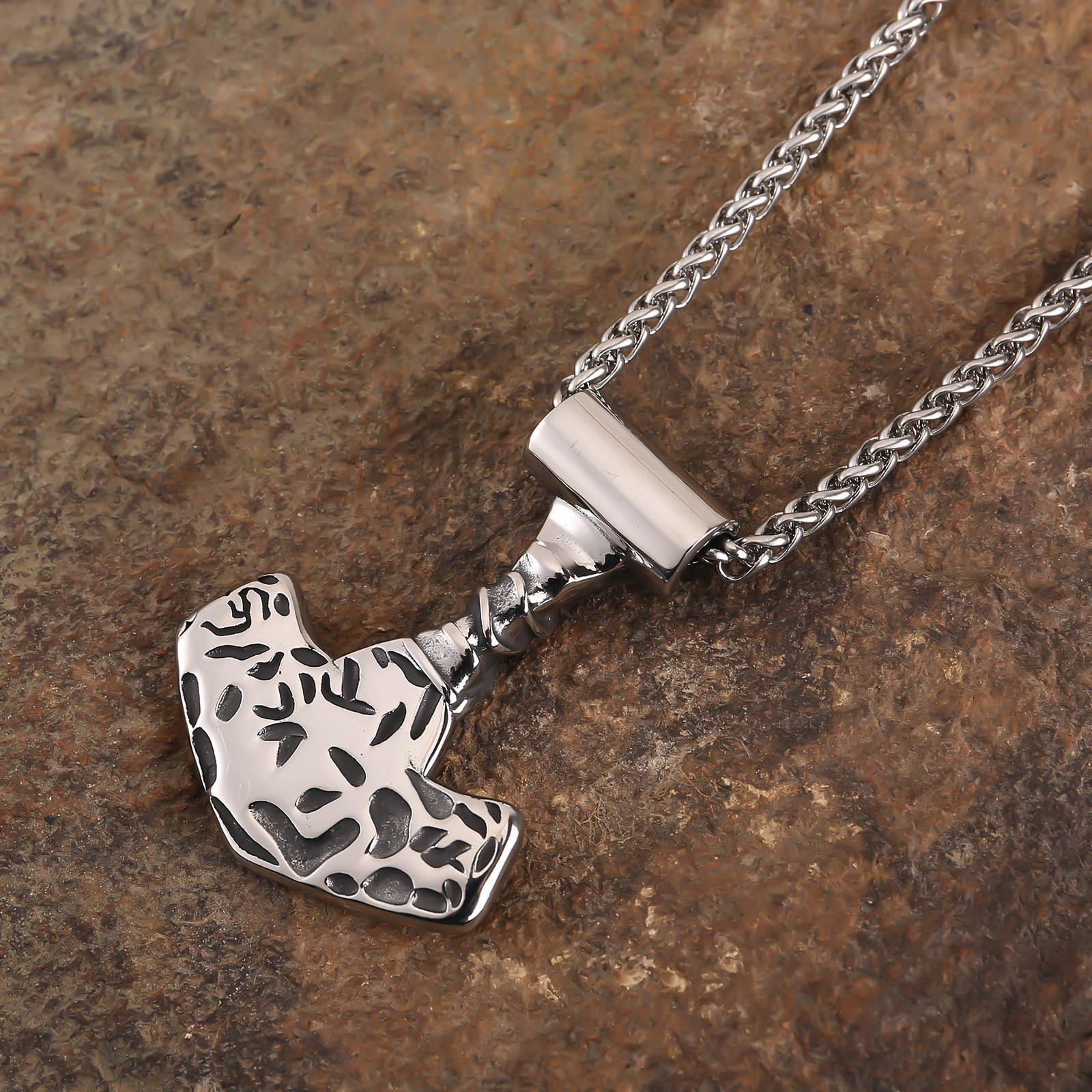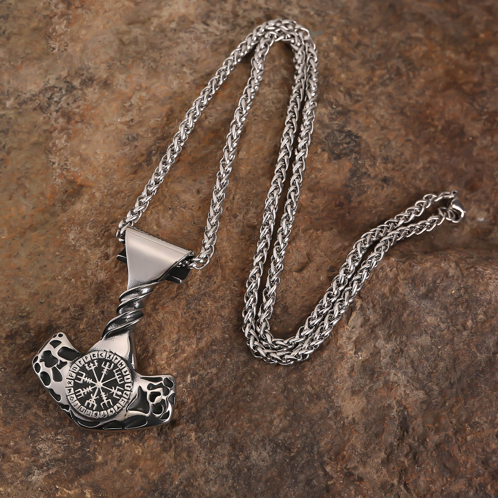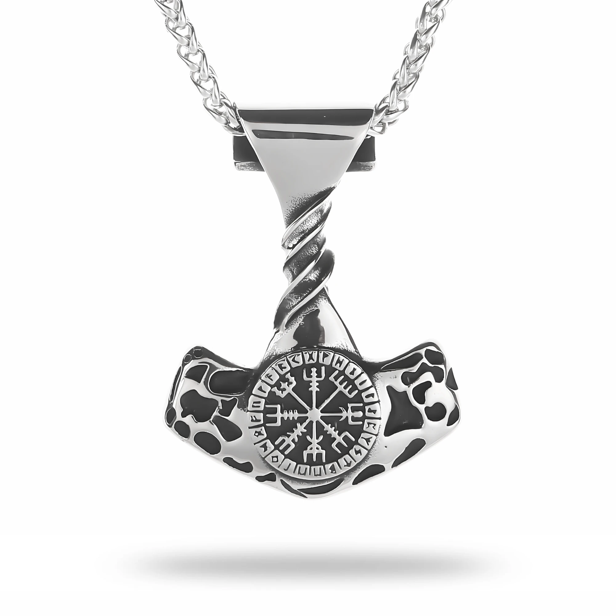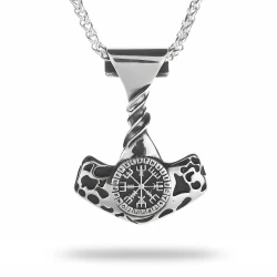 Oto i amulet wikingów w prawdziwie nordyckim stylu! Naszyjnik wykonany ze szlachetnej stali zawieszony jest na solidnym łańcuchu. Zawieszka ma kszałt Mjolnira, czyli słynnego atrybutu nordyckiego boga gromu. Młot Thora ma oryginalną powierzchnię, a w jego środku widnieje magiczny symbol Vegvisir, dzięki któremu wikingowie bezpiecznie odbywali morskie podróże. Na nordyckim amulecie widnieją nie dwa, a trzy słynne wikińskie symbole. Wokół kompasu wikingów umieszczono wszystkie 24 znaki alfabetu runicznego. Naszyjnik dostarczany jest w eleganckim pudełku.