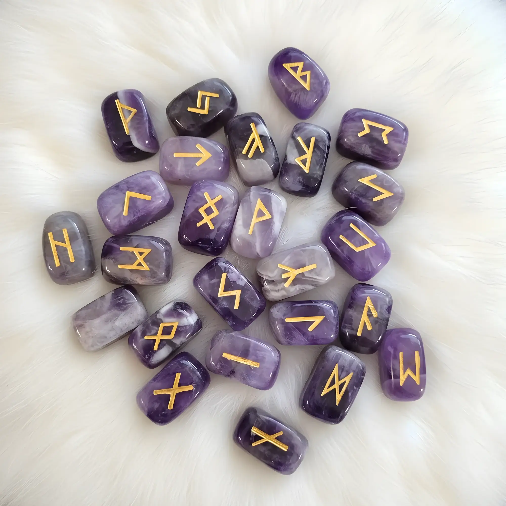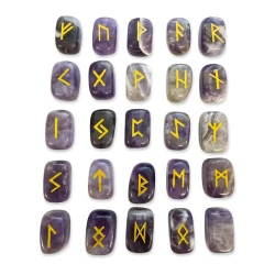 Runy wyryte w Ametyście łączą nordycką tradycję symboli z energią minerału kojarzonego z harmonią i intuicją. Każdy kamień został starannie oszlifowany oraz ręcznie rytowany i malowany, by oddać wyjątkowy charakter symboliki runicznej.